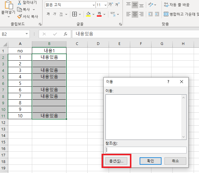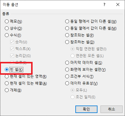 이동 옵션으로 이동을 하고 나면, 빈 셀을 체크한 후 확인을 누른다.