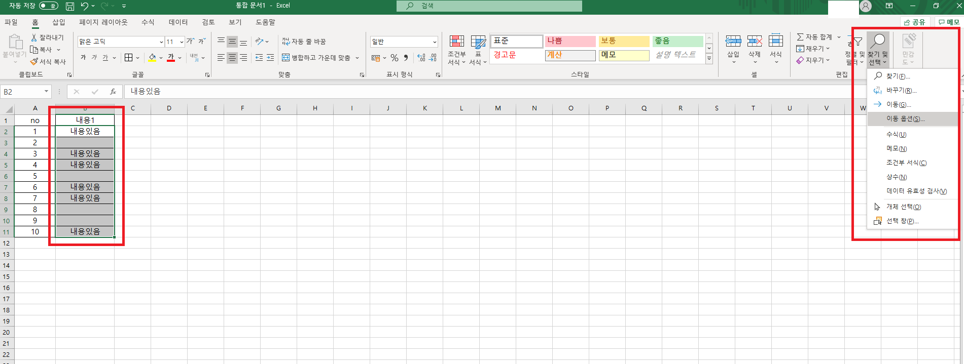 이동 옵션은 홈을 선택한 후 제일 우측에 있기 때문에 찾기 힘들 수 있지만, 위와 같은 화면대로 선택하면 된다. 그리고 단축키로 좀 더 쉽게 알 수 있는데 Ctrl + G를 누르면 된다.