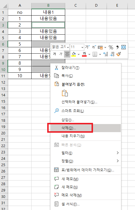 빈칸이 선택된 것을 확인 한 후, 마우스 우클릭으로 메뉴를 띄워서 삭제를 선택한다.