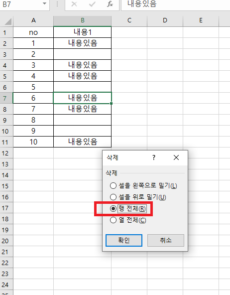 삭제 메뉴에서 "행 전체"를 선택한다.