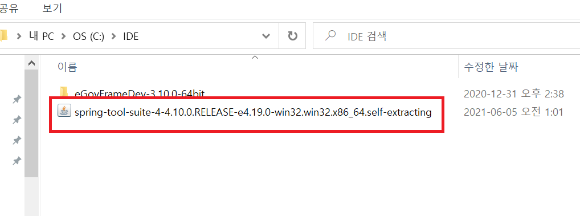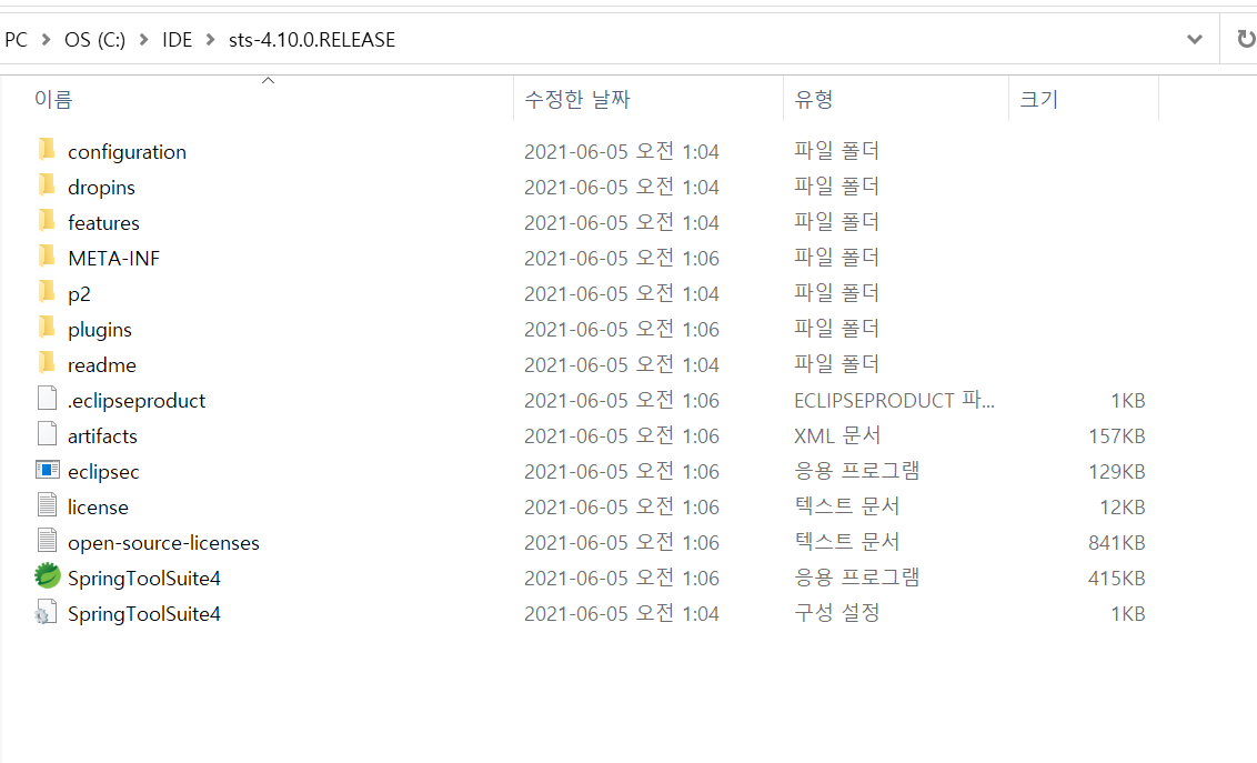 압축해제가 완료되면, sts-x.x.x.RELEASE 라는 폴더가 생기는데 이 폴더에 있는 SpringToolSuite4 파일을 실행하면 스프링이 내장된 이클립스가 실행된다.