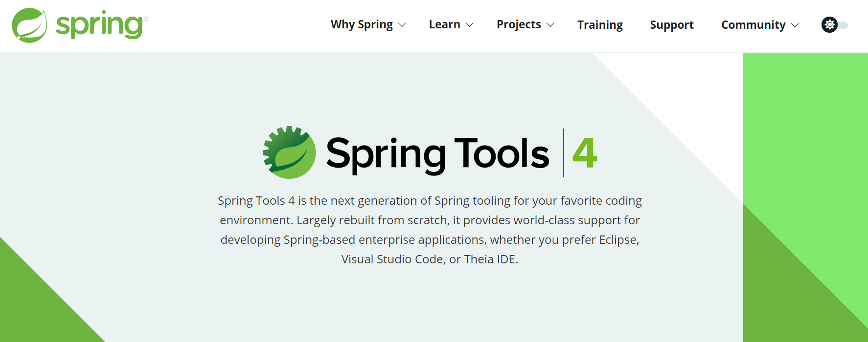 Largely rebuilt from scratch, Spring Tools 4 provides world-class support for developing Spring-based enterprise applications, whether you prefer Eclipse, Visual Studio Code, or Theia IDE.