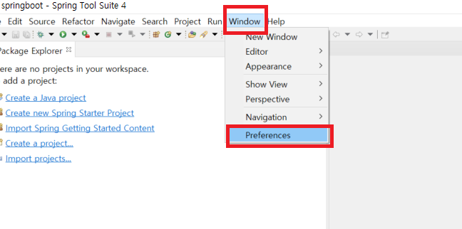 상단 메뉴에서 Window를 선택하고 최하단에 있는 Preferences 탭을 선택한다.
