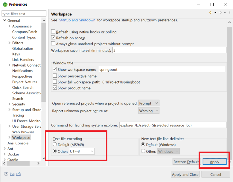 우선 제일 위에 있는 General을 선택하면 제일 하단에 Workspace가 보인다. 이 메뉴를 선택하게 되면 개발환경을 세팅할 수 있는데 Text file encoding에서 UTF-8을 선택한다.