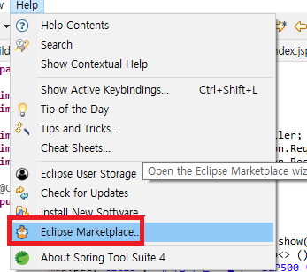스프링툴슈트(STS)에는 기본적으로 웹기능들이 세팅되어 있지 않다. 그러다보니 JSP 등을 개발하기가 상당히 까다롭고 불편한데 이클립스 마켓에서 플러그인(plugin)을 설치하는 것으로 해결이 가능하다.