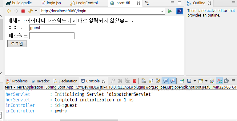 로그인 jsp 페이지에 메세지를 받을 수 있는 곳을 지정하였고, action도 login/action이 아니라 login만 호출하게 변경한다.