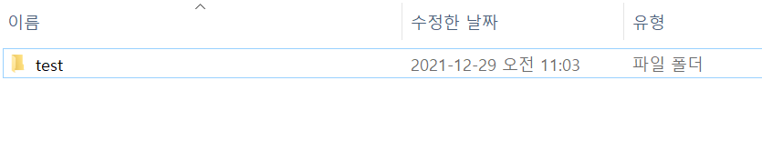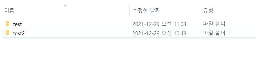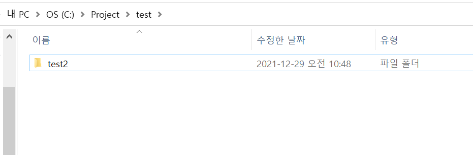 C 드라이브에 Project/test 폴더를 생성하고 그 안에 test2라는 폴더를 추가로 생성하였다. 우리는 앞으로 이 폴더안에 test1을 추가로 생성하고, test2는 삭제하는 것을 알아보도록 한다.