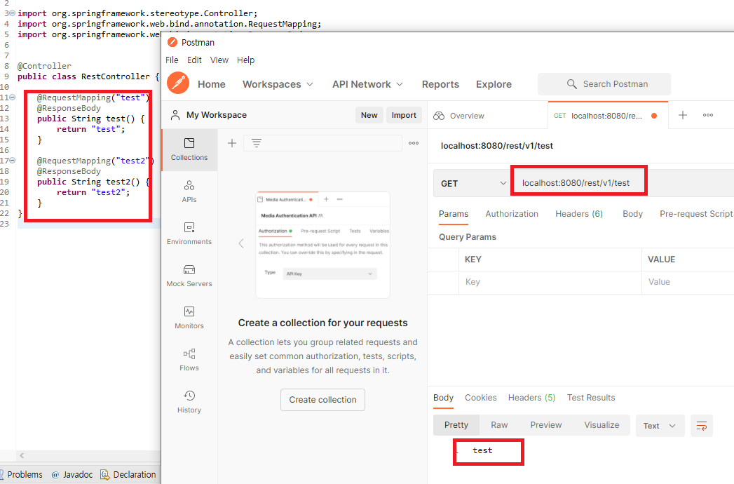위와 같이 Controller의 method에 /rest/v1/test를 지정하였을 때, /rest/v1이 공통으로 들어간다면, 일반적으로는 class 상단에 Base URL을 넣어서 호출을 하게 된다.