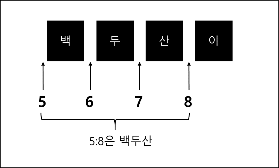 인덱스는 시작이 0으로 시작되며, 각각 0:동, 1:해, 2:물, 3:과, 4:공백, 5:백으로 인덱스가 잡히기 때문에 백이 있는 위치가 5이다. 8의 위치는 백두산이에서 마지막인 이인데, 이가 위치한 곳까지 가지고 오라고 했기 때문에 이를 시각적으로 보면 다음과 같다.