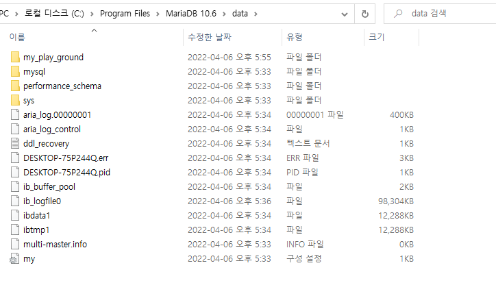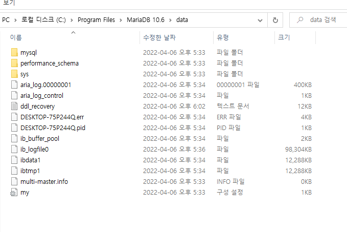 결과를 보면, MariaDB가 설치된 폴더 하위에 data라는 폴더가 있는 것을 알 수 있다. 해당 폴더로 확인을 해보면