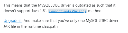 java.lang.AbstractMethodError: com.mysql.jdbc.Connection.isValid(I)Z at com.zaxxer.hikari.pool.PoolBase.checkValidationSupport(PoolBase.java:464) ~[HikariCP-4.0.3.jar:na] at com.zaxxer.hikari.pool.PoolBase.checkDriverSupport(PoolBase.java:447) ~[HikariCP-4.0.3.jar:na] at com.zaxxer.hikari.pool.PoolBase.setupConnection(PoolBase.java:416) ~[HikariCP-4.0.3.jar:na] at com.zaxxer.hikari.pool.PoolBase.newConnection(PoolBase.java:369) ~[HikariCP-4.0.3.jar:na] at com.zaxxer.hikari.pool.PoolBase.newPoolEntry(PoolBase.java:206) ~[HikariCP-4.0.3.jar:na] at com.zaxxer.hikari.pool.HikariPool.createPoolEntry(HikariPool.java:476) ~[HikariCP-4.0.3.jar:na] at com.zaxxer.hikari.pool.HikariPool.checkFailFast(HikariPool.java:561) ~[HikariCP-4.0.3.jar:na] at com.zaxxer.hikari.pool.HikariPool.<init>(HikariPool.java:115) ~[HikariCP-4.0.3.jar:na] at com.zaxxer.hikari.HikariDataSource.getConnection(HikariDataSource.java:112) ~[HikariCP-4.0.3.jar:na] at org.springframework.jdbc.datasource.DataSourceUtils.fetchConnection(DataSourceUtils.java:159) ~[spring-jdbc-5.3.18.jar:5.3.18] at org.springframework.jdbc.datasource.DataSourceUtils.doGetConnection(DataSourceUtils.java:117) ~[spring-jdbc-5.3.18.jar:5.3.18] at
