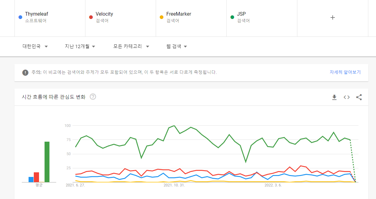 Velocity라는 말은 사실, 속도라는 의미이기 때문에 JSP나 FreeMarker, Thymeleaf에 비해서 키워드의 유리함이 있기에 사실 상, Thymeleaf가 Velocity보다 앞서지 않았나 싶다.