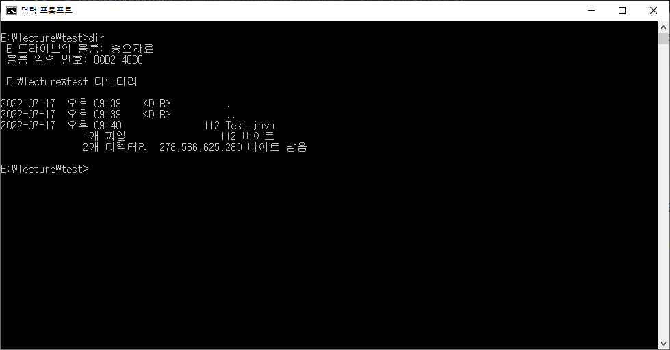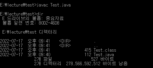 위와 같은 샘플 클래스를 담은 Test.java 파일을 메모장으로 생성해본 후, 해당 파일이 있는 위치로 이동한다