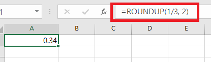 위의 예시를 보면 1/3이기 때문에 값이 0.3333으로 떨어지기 때문에 2자리 수 반올림을 하게 되면, 0.33으로 떨어지게 됩니다. 하지만 ROUNDUP을 사용하게 되면 위 예시처럼 0.34가 됩니다.