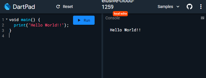 다트를 배우는 온라인 도구가 바로 DartPad인데 위 2가지의 독립적인 URL 모두 제공을 하고 있습니다. 어디서 하든 동일한 결과와 동일한 환경이 제공하니 아무 사이트에서 코딩을 하면 됩니다.