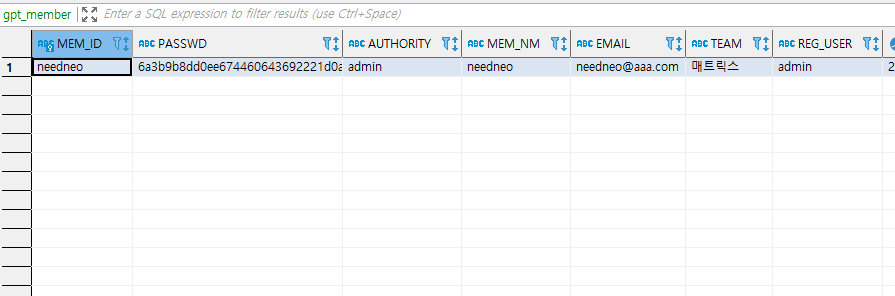 위와 같이 gpt_member라는 테이블에는 패스워드 컬럼이 존재하는데 String에 대응하는 varchar 사이즈를 60으로 잡아서 생성하였습니다.