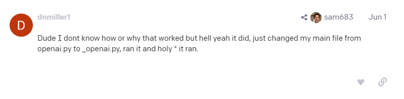 Dude I dont know how or why that worked but hell yeah it did, just changed my main file from openai.py to _openai.py, ran it and holy * it ran.