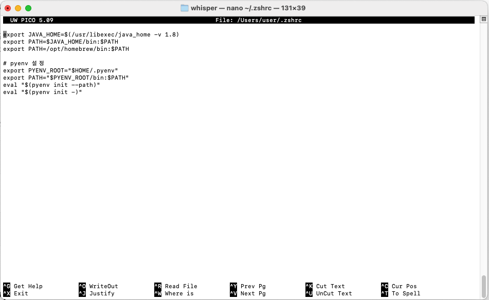 환경 설정을 하기 위해서 zshrc를 nano 편집기로 열어야 한다.