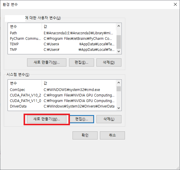 하단의 시스템 변수의 새로 만들기 버튼을 클릭한다.