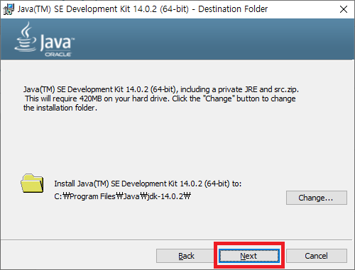 Java는 왠만하면 경로를 바꾸지 말고 그냥 설치하도록 한다. 별도의 IDE 환경을 맞춰야 하는 상황(대형 프로젝트에서 주로 환경을 맞추는 경우)이 아니기에 그냥 Next를 클릭한다