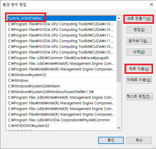 이라는 값을 입력하고 해당 환경 변수를 위로 이동을 하여 최상단으로 위치시킨다. 최상단으로 위치시키지 않을 경우 다른 자바가 실행되는 사태가 발생할 수 있다.