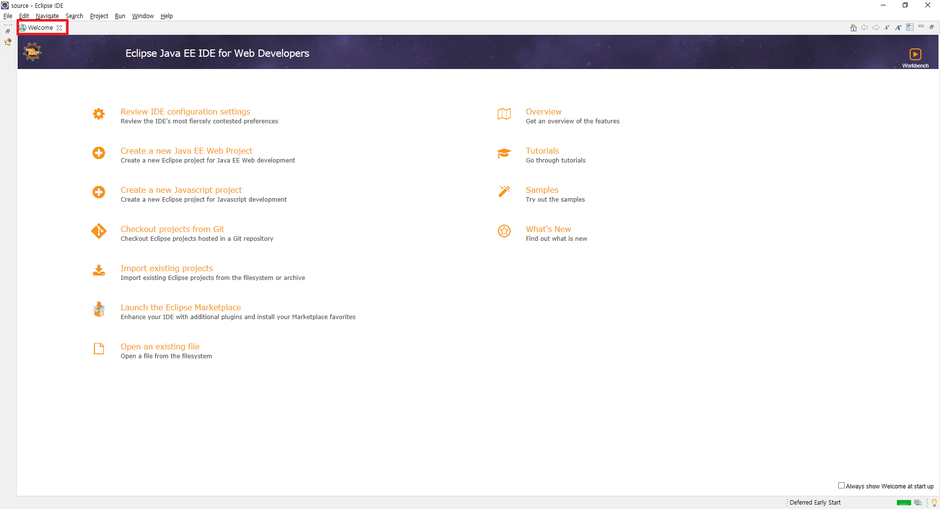 이클립스의 Workspace를 처음 지정하면 나오는 화면으로 Welcome 탭을 닫는다.