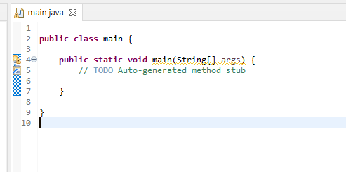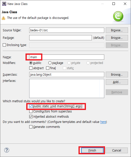 클래스 설정하는 화면에서 이름은 아무렇게 해도 상관 없지만 필자는 main을 선택하였고, public static void main을 체크한다. 자바를 실행하기 위해서는 1개 이상의 main이 필요하기 때문이다.