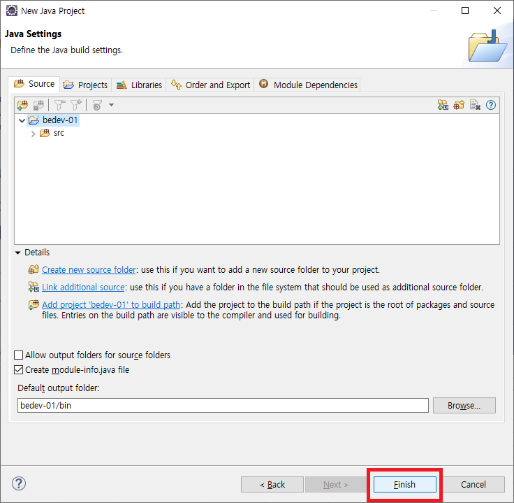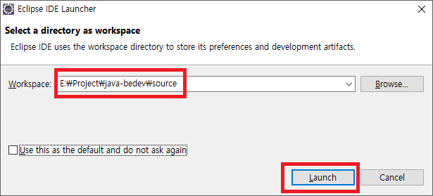 이클립스를 실행하면, 작업공간(Workspace)를 지정해야 하는데, 필자는 Project/java-bedev/source라는 폴더를 생성하여 해당 이름으로 지정을 하였다. 선택이 마무리 되었다면, Launch를 클릭한다.