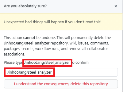 마지막으로 한번 더 경고 레이어가 뜨는데 여기에 레파지토리의 주소를 그대로 입력한 후, 아래의 "I understand the consequences, delete this repository" 버튼을 클릭한다.