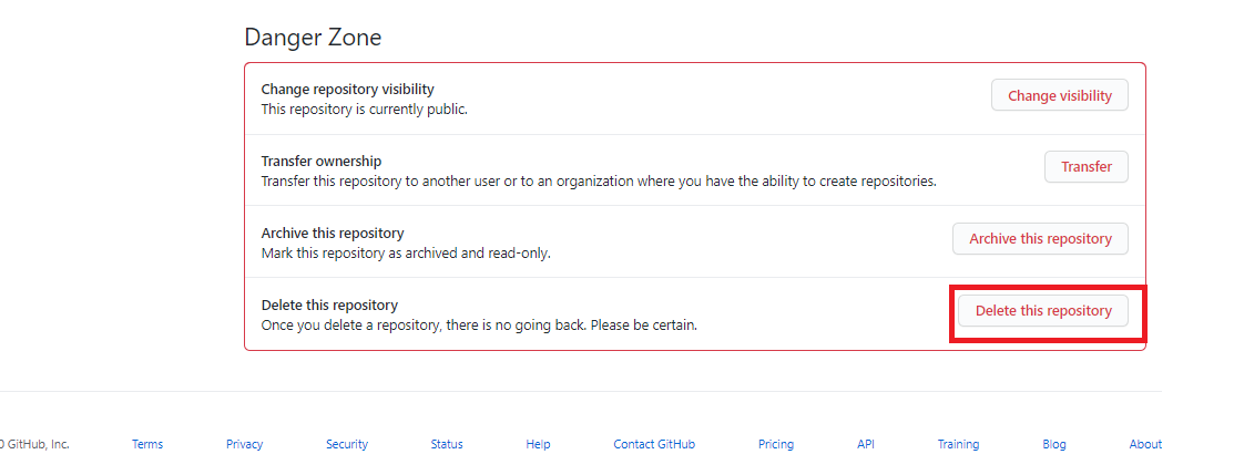 세팅에서 스크롤을 아래로 내리면, Danger Zone이라는 영역이 나오고 Delete this repository라는 버튼이 존재한다.