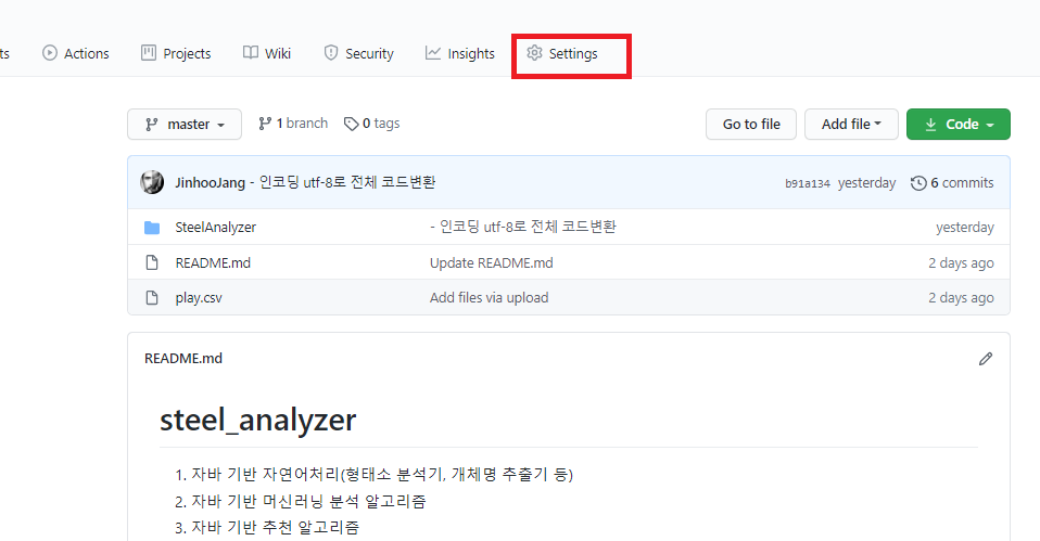 Private 프로젝트가 많다보니 모자이크 처리 하였지만 위에 있는 steel_analyzer라는 레파지토리를 삭제하고 다시 만들 예정이라 해당 레파지토리를 선택한다.