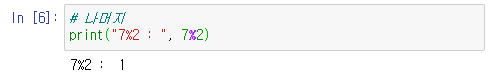 숫자 사이에 %를 입력하면 왼쪽 값을 오른쪽으로 나눈 후 나머지 값 표시