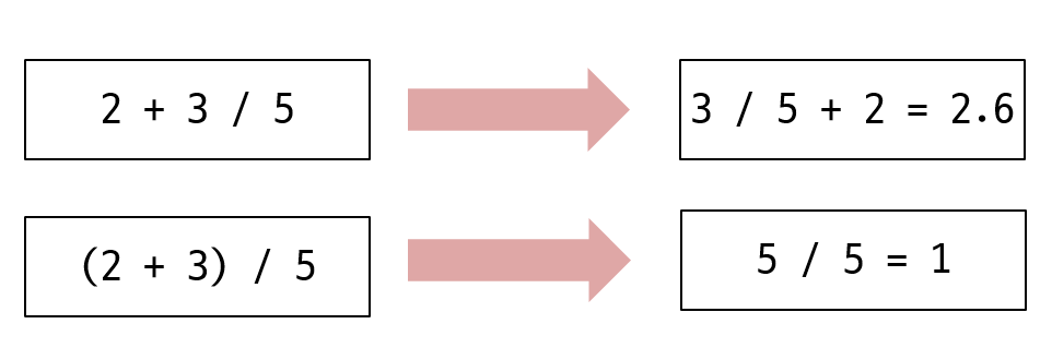 우선 연산을 수행한 것과 우선연산을 수행하지 않았을 때의 값의 연산 알고리즘이다. 소괄호를 입력하지 않으면 나누기가 먼저 수행되기 때문에 3 / 5가 먼저 수행되고 뒤이어 2를 더한다. 결국 0.6 + 2가 되기에 2.6이 출력된다. (2+3) / 5의 경우 소괄호가 우선순위가 되기 때문에 2+3을 먼저 수행하게 된다. 결국 5/5가 되어 최종적으로 1이 출력된다.
