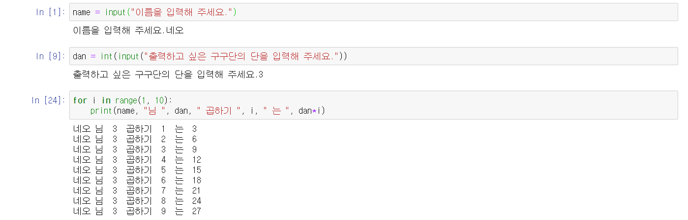 print(name, "님 ", dan, " 곱하기 ", i, " 는 ", dan*i)