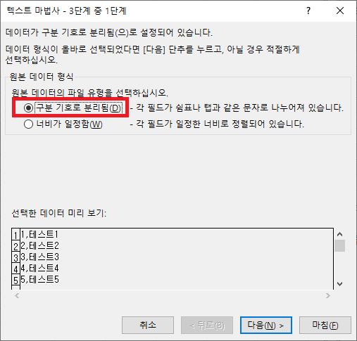 원본 데이터의 구분 유형을 파악하고 구분 기호로 분리됨이나 너비가 일정함 중 하나를 선택한다. 이 예시는 콤마라는 문자값을 기준으로 분리를 할 예정이기 때문에 상단 "구분 기호로 분리됨"을 선택하였고, 선택이 완료되었으면 다음을 클릭한다.