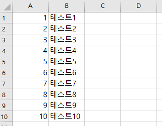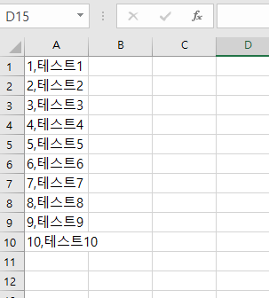 우선 나눌 데이터를 엑셀에 복사 및 붙여넣기(Copy & Paste)를 수행한다. 이때 콤마(,)값을 인식하지는 못하지만 위와 같이 행은 인식한다. 즉, 예제를 가지고 했다면 A1행부터 A10행까지 만들어졌을 것이다.