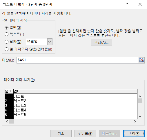 구분된 열에 대해서 서식을 지정할 수 있다. 데이터를 분리하기 전이라면 일반적인 텍스트 형태였기 때문에 열에 따라 날짜, 텍스트, 숫자 등 다양한 열의 서식을 지정한다. 물론 이 작업은 분리된 이후에 처리해도 아무런 상관이 없으니 그냥 마침을 선택한다.