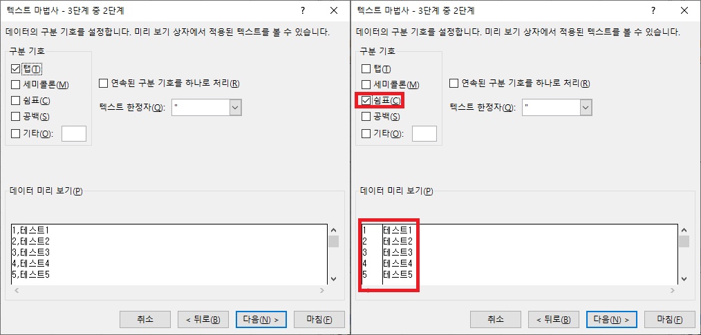 현재 데이터가 쉼표 기준으로 되어 있으니 탭을 체크해제한 후 쉼표를 체크하면 하단의 데이터 미리 보기 영역에서 우측 위의 캡쳐 화면처럼 데이터가 구분이 되었다는 것을 볼 수 있다.