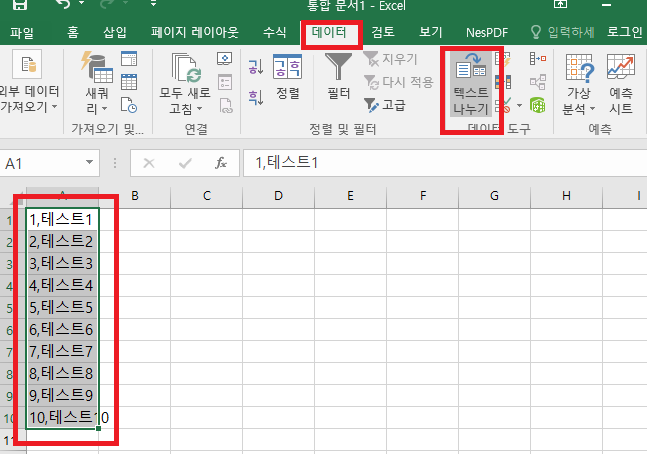 나눌 데이터를 드래그(drag)하여 선택을 하고, 메뉴에서 데이터 탭을 선택하여 텍스트 나누기 아이콘을 클릭한다.