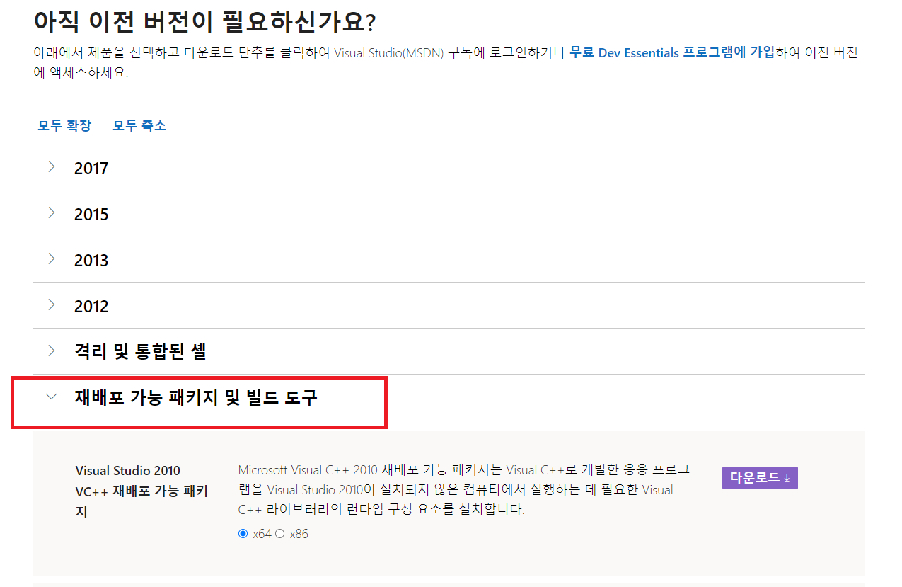 위 링크는 최신 visual studio 가 아닌 이전 버전을 다운로드 받을 수 있는 링크이다.