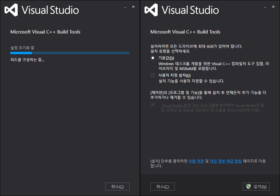 다운로드 받은 파일을 클릭하면 위와 같이 설정 초기화 중이 뜬 이후 기본과 사용자 지정을 설정하는데 기본을 클릭하고 설치 버튼을 클릭한다. (4GB 공간 압박)