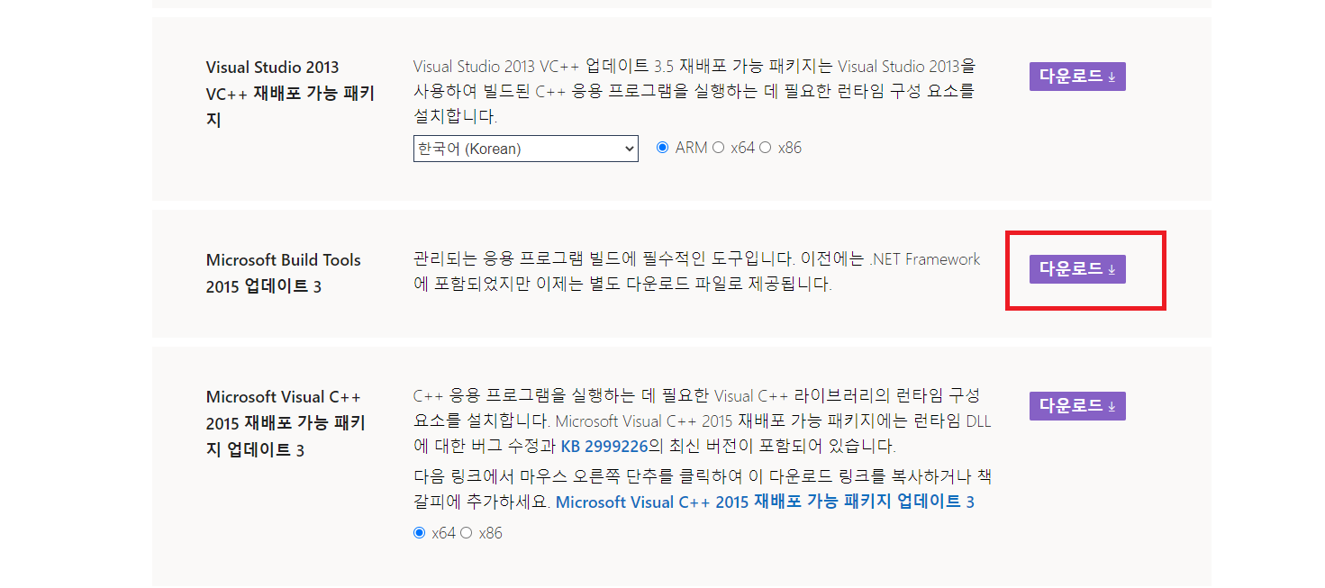 Microsoft Build Tools 2015 업데이트 3의 다운로드 버튼을 클릭한다.