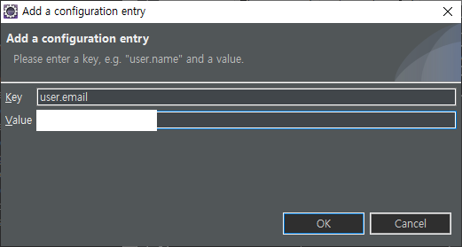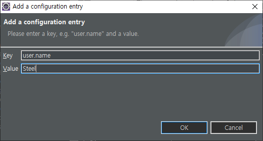 Add a configuration entry 화면이 나오면 우선 Key에 user.name을 입력하고, Value에 원하는 이름을 적고, OK를 클릭한다.