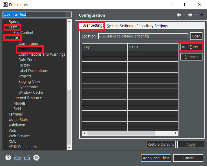 Team -> Git -> Configuration -> User Settings -> Add Entry 선택