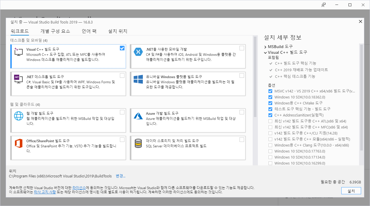 Visual C++ 빌드 도구를 선택하면 Default로 오른쪽 옵션들 5개가 선택되어 진다. 옵션을 보면, Windows용 C++ CMake 도구가 보인다. 무려 필요한 총 공간이 6.39GB로 CUDA와 비주얼 스튜디오 라이브러리만 설치해도 10기가 정도 잡아먹는 것 같다. (진짜 인공지능 개발자들은 하드공간 넉넉하게 준비하는게 좋을 듯)